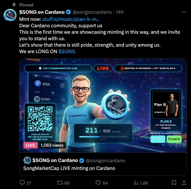naime dok ja ovo tipkam PREKO 1000 LJUDI iz cijelog svijeta upravo na X nalogo od projekta Songmarketcap sluša naš Blockchain Session Ambien Set, u to vrijeme su na ekranu LIVE brojke od mintanja naše najnovije NFT pjesme.